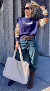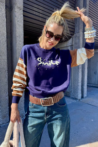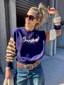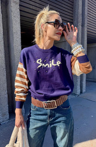 Chandail à manches longues en tricot léger, col rond, manches avec rayures. Détail écrit SMILE appliqué sur le devant, agrémenté de strass pour une touche brillante et tendance.