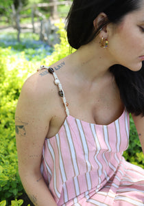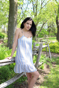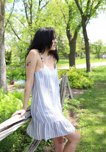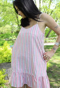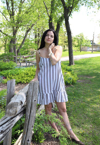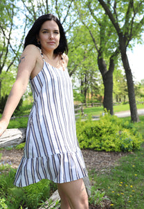 Robe courte et légère à rayures, avec de fines bretelles ajustables. Détail volant à l’ourlet pour une touche féminine et estivale.