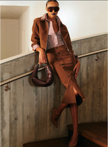 Jupe ajustée en ultra suède avec boutonnage sur le devant. Ganses pour ceinture et poches appliquées à rabat pour un style pratique et raffiné.