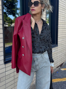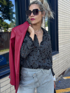 Une création originale qui marie la robustesse du denim à la délicatesse florale de la dentelle pour un style à la fois féminin et audacieux.