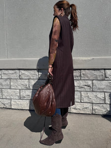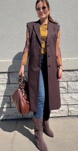 Un long gilet élégant à motif rayé, doté d’un col tailleur raffiné. Ses poches passepoilées et sa fermeture à trois boutons lui confèrent une allure chic et structurée, idéale pour compléter vos tenues avec sophistication.