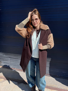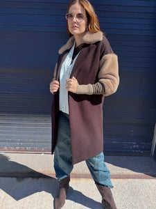Un manteau sophistiqué en laine doté d’un col tailleur élégant. Les manches et le col sont agrémentés de fourrure pour une touche luxueuse, tandis que les avant-bras en tricot côtelé apportent confort et originalité. Une pièce chic et raffinée pour affronter la saison avec style.