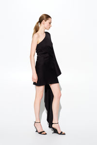 Robe asymétrique noire en satin fluide, dévoilant une épaule avec élégance. Son drapé spectaculaire part de l’épaule jusqu’au sol, créant un effet cape. Silhouette près du corps, tissu satiné doux au toucher avec fermeture invisible sur le côté.