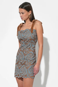 CETTE RAVISSANTE ROBE MINI, DANS UNE JOLIE TEINTE CLAIRE, EST ORNÉE D’UNE BRODERIE DÉLICATE QUI LUI CONFÈRE UNE TOUCHE D’ÉLÉGANCE ARTISANALE. ELLE PRÉSENTE UNE FLATTEUSE ENCOLURE EN V AVEC UN DÉLICAT LIEN À NOUER, PERMETTANT UN STYLE AJUSTABLE, AINSI QUE DE ROMANTIQUES MANCHES VOLANTES QUI SOULIGNENT SON CHARME FÉMININ.
