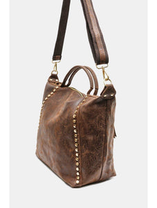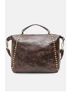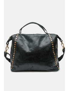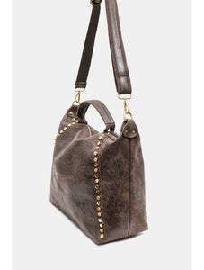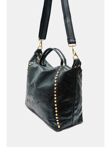 CE SAC ALLIE ÉLÉGANCE ET CARACTÈRE AVEC SES FINITIONS LÉGÈREMENT BRILLANTES ET SA LIGNE DE CLOUS DORÉS SUR LE CÔTÉ. DOTÉ D’UNE ANSE COURTE ET D’UNE BANDOUÈRE AJUSTABLE ET AMOVIBLE, IL OFFRE UNE DOUBLE FAÇON DE LE PORTER, À LA MAIN OU EN BANDOULIÈRE. PRATIQUE ET TENDANCE,