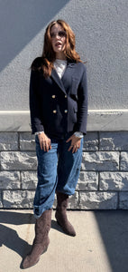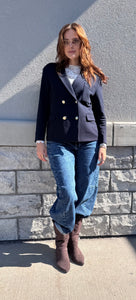 Un veston sophistiqué à la coupe double-breasted, rehaussé de boutons dorés gravés du logo pour une finition luxueuse. Une pièce élégante et intemporelle qui apporte caractère et raffinement à vos tenues.