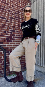 Pantalon  avec revers, doté de ganses pour ceinture et accompagné de sa ceinture assortie. Son élastique au dos à la taille, ainsi que sa fermeture zip et bouton, assurent confort et ajustement parfait.