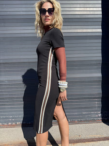 Robe ajustée à col rond et manches courtes, rehaussée de bandes latérales qui allongent la silhouette. Une pièce sportive et tendance, parfaite pour un look casual-chic.
