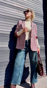 Veston élégant au motif Prince-de-Galles, orné de broches décoratives. Fermeture à 1 bouton et poches passepoilées avec rabat pour une allure chic et structurée.